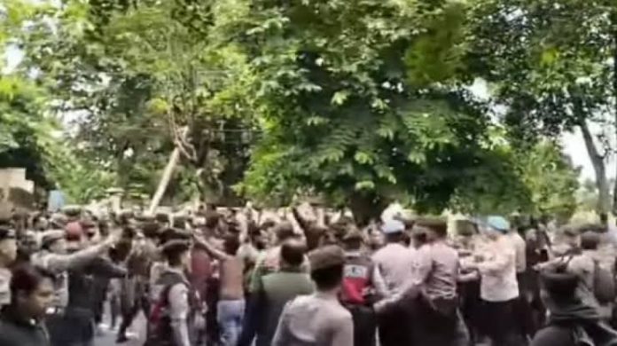 Awalnya, demo berjalan lancar. Polisi terlihat berjaga dengan menyiapkan water cannon dan rantis Brimob demi menjaga ketertiban. Namun tiba-tiba massa aksi pecah hingga terjadi bentrok dengan aparat yang bertugas. Polisi pun langsung menembakkan water canon.